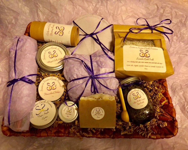 Our ” Congratulations you’re pregnant” basket contains 13 items for the mother to be to pamper herself during her pregnancy. These items are: Whipped belly butter, vegan nipple butter,hemorrhoid helper,body and baby dusting powder (no talc),lip balm,handcrafted soap (scents are seasonal),flower bath bomb,coconut/coco/coffee foot scrub, epsom salt bath(scent/flowers varie), our amazing reusable “MilkPads”,coloring pencils,a unique pregnancy journal and a multi-use seagrass basket. With the exception of the basket all the items are handcrafted by mothers for mothers in the mountains of northern California and Oregon, they are 99.99% organic and natural. We have also worked hard to minimize plastic so most every item in the basket is recyclable,reusable or compostable. There is very little waste in our process and we are proud of that fact.